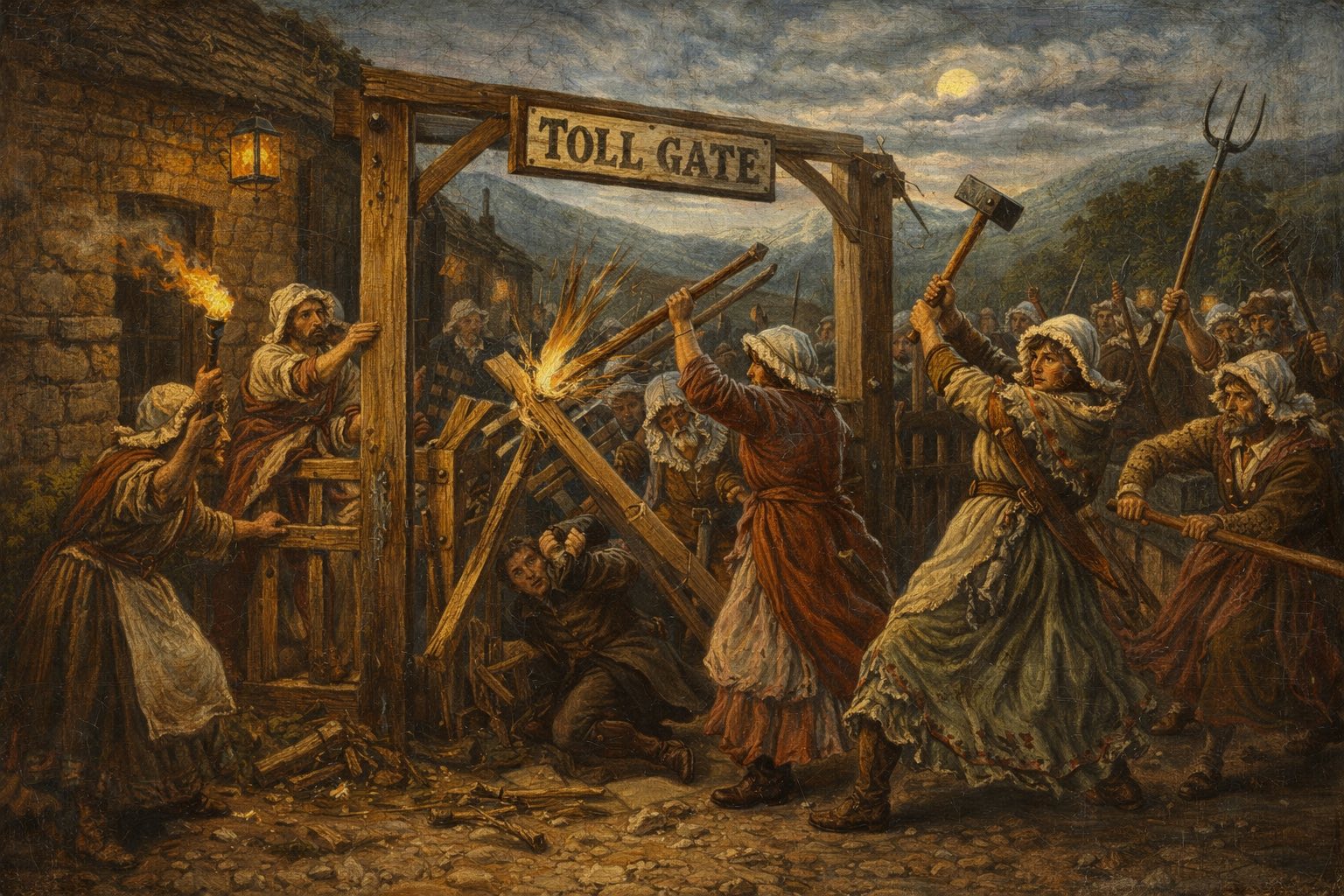 When the Rebecca Riots erupted across south-west Wales between 1839 and 1843, many of the same themes reappeared. Once again, communities protested what they saw as unfair economic burdens—this time the tollgates imposed on already impoverished farmers and labourers. Like the Kidwelly rioters, Rebecca’s followers acted collectively, targeted symbols of injustice, and justified their actions through shared moral arguments rather than political ideology.